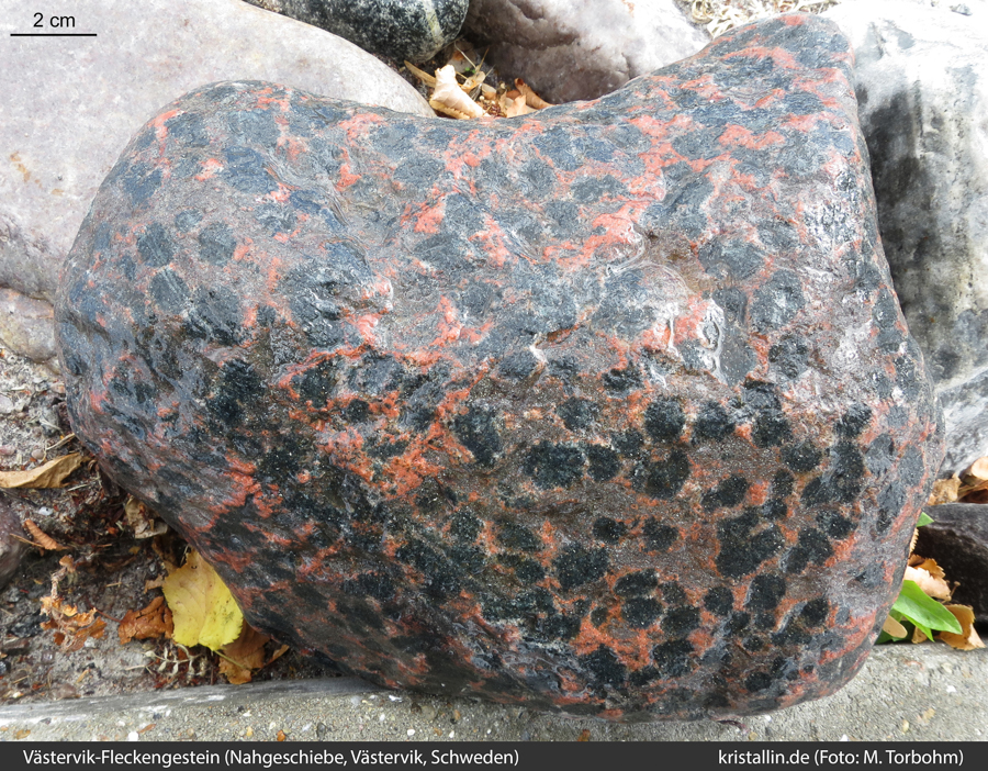 (22/55) Graues Fleckengestein mit gleichmäßig verteilten Flecken. Teilweise sind unvollständige und kräftig orangefarbene Säume erkennbar. Der Stein ist etwa 20 cm breit und liegt auf dem Parkplatz des ICA-Supermarkts in Västervik.