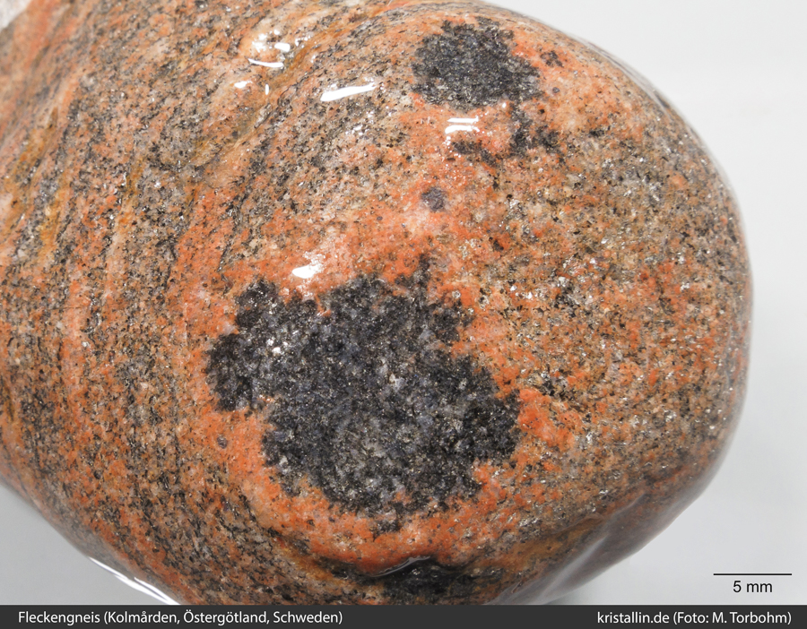(35/55) Detailansicht eines orange-grauen Gneises, hier ausnahmsweise mit feinkörnigen Flecken.