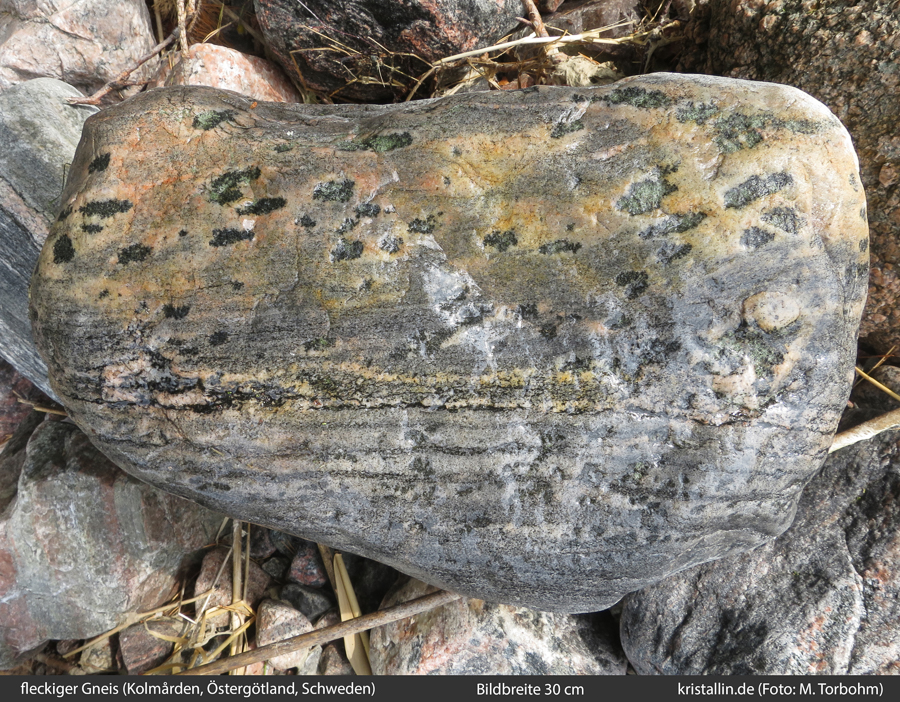 (37/55) Übergang einer grauen und quarzitischen Partie mit Sedimentstrukturen (unten) in ein gelblich-graues Fleckengestein.