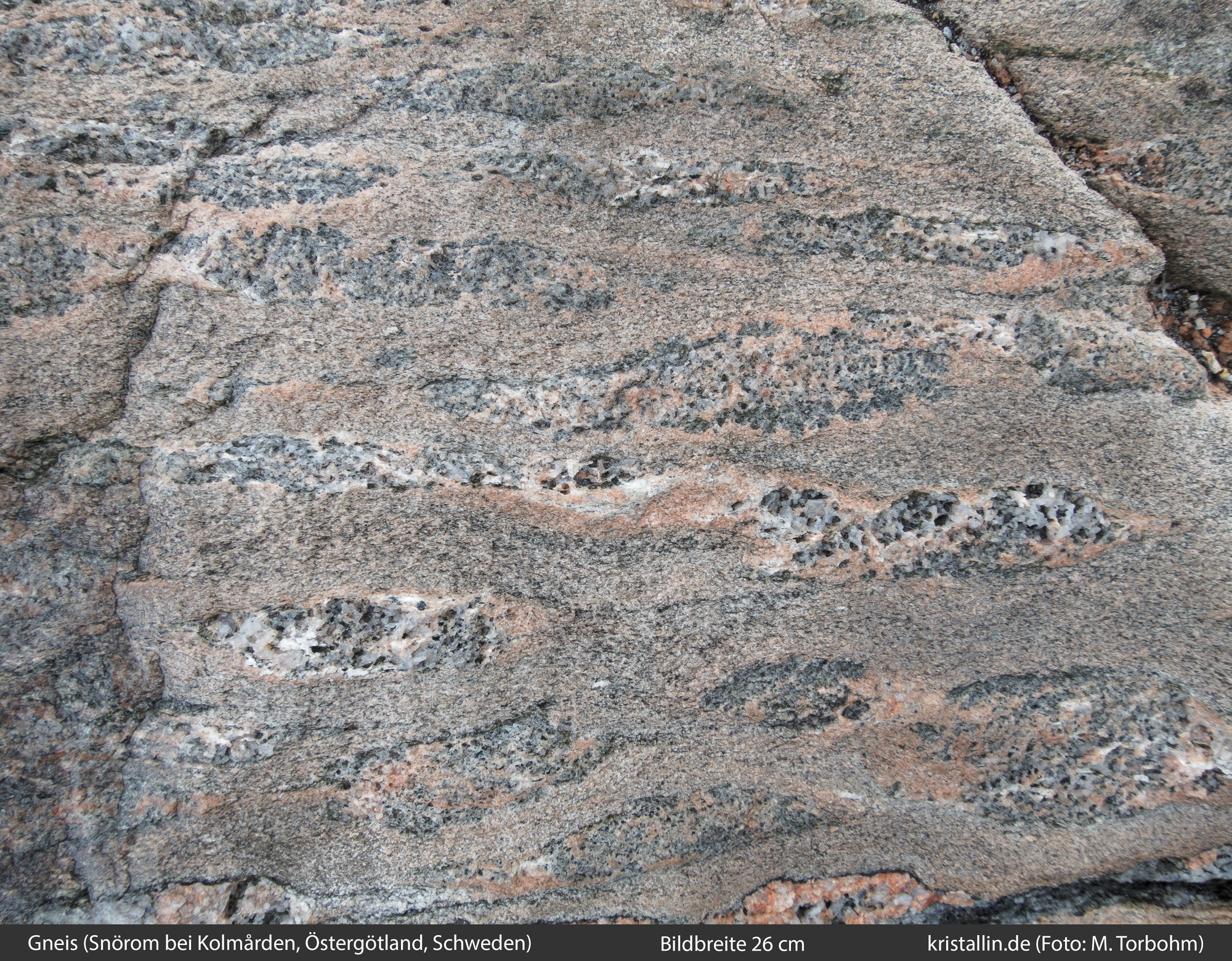 (38/55) Ein Teil der bei Kolmården anstehenden Gneise zeichnet sich durch dezimeterlange, elliptisch geformte und grob kristallisierte Flecken mit orangeroten Säumen aus. Anstehender Fels in Snörom bei Kolmården, Bildbreite 26 cm.