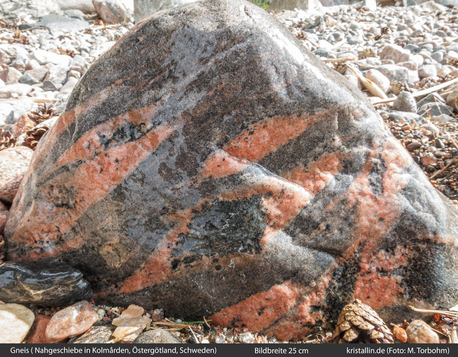 (39/55) Wenige Hundert Meter Luftlinie südlich vom Anstehenden findet man den gleichen Gesteinstyp als Strandgeröll wieder. Bildbreite etwa 25 cm.