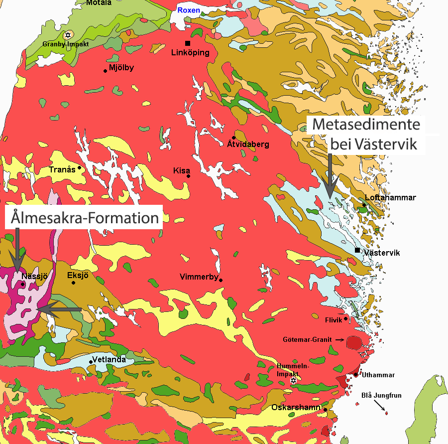 Die Västervik-Formation liegt an der südschwedischen Ostseeküste und besteht aus metamorph überprägten Ablagerungen (hellblau). Nördlich davon erstrecken sich svekofennische Gesteine (gelb, braun) und westlich und südlich der Transskandinavische Magmatitgürtel (rot, gelb). Die im Text erwähnte Ålmesakra-Formation liegt am linken Bildrand.