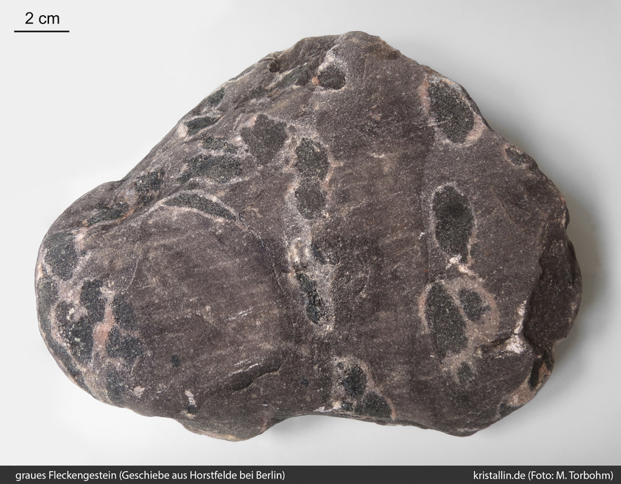 (55/55) Graues Fleckengestein als gekritztes Geschiebe. Der Fund ähnelt den Fleckengesteinen von Östra Skälö (s. Abb. 15). Ungeklärt ist bislang, ob es ähnliche Gesteine auch außerhalb des Västervik-Gebiets gibt.