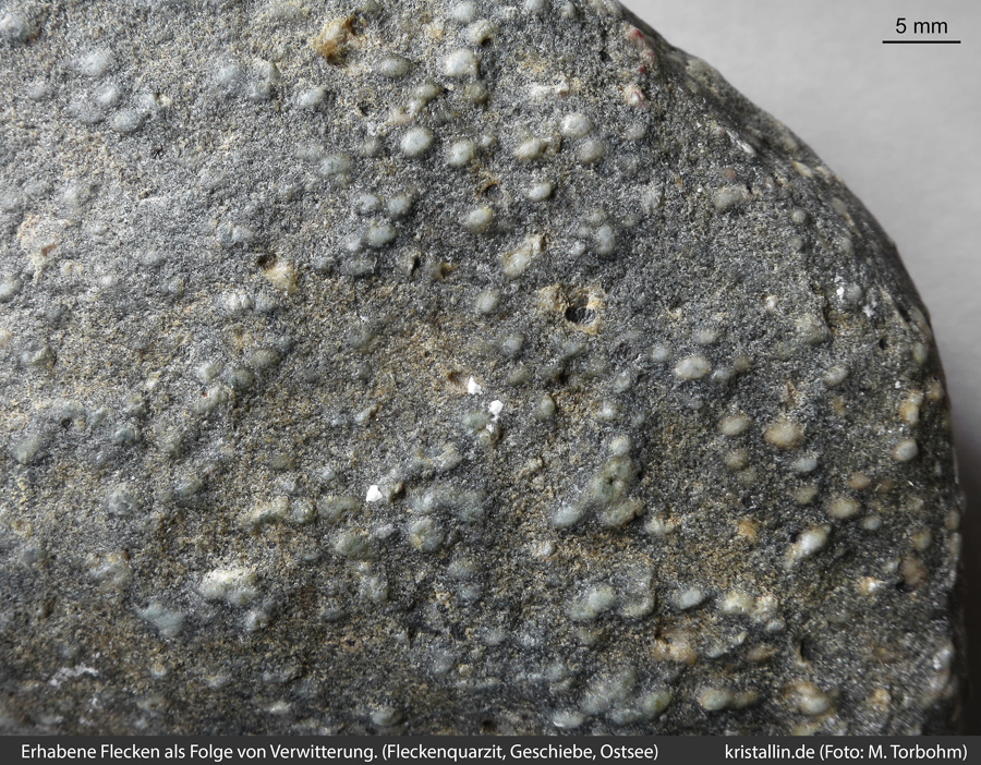 (2/34) Die Grundmasse verwittert leichter als die weißen Flecken, die dadurch über die Gesteinsoberfläche ragen. Diese Eigenschaft kann man auch an anderen Fleckengesteinen beobachten, nicht nur an Fleckenquarziten.