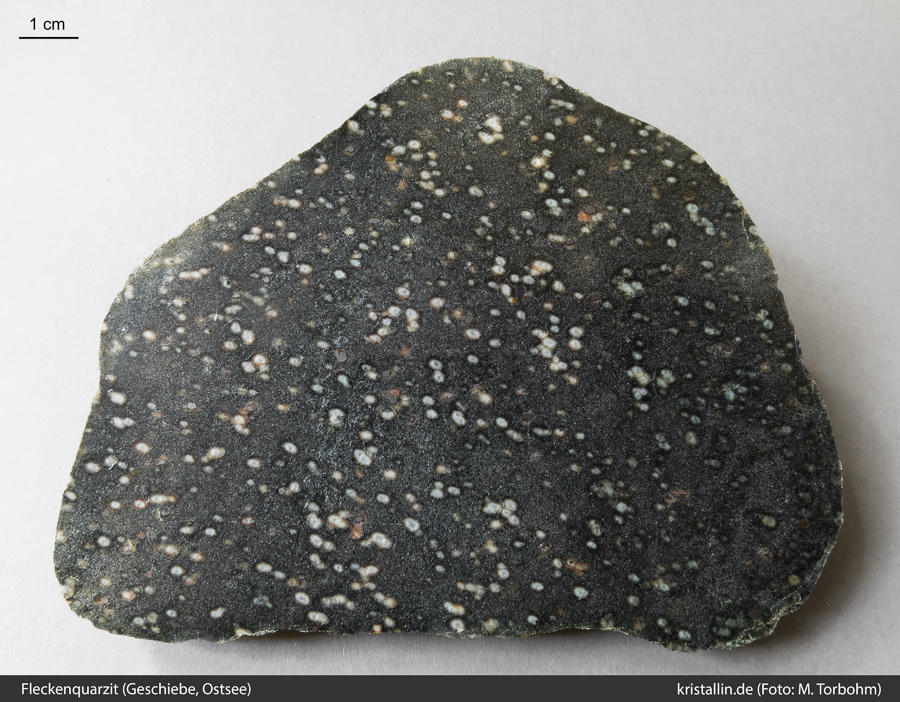 (3/34) Polierte Schnittfläche, gleicher Stein wie im vorigen Bild. Die durchgehend graue Grundmasse mit weißen Flecken lässt keine Deformationserscheinungen erkennen.