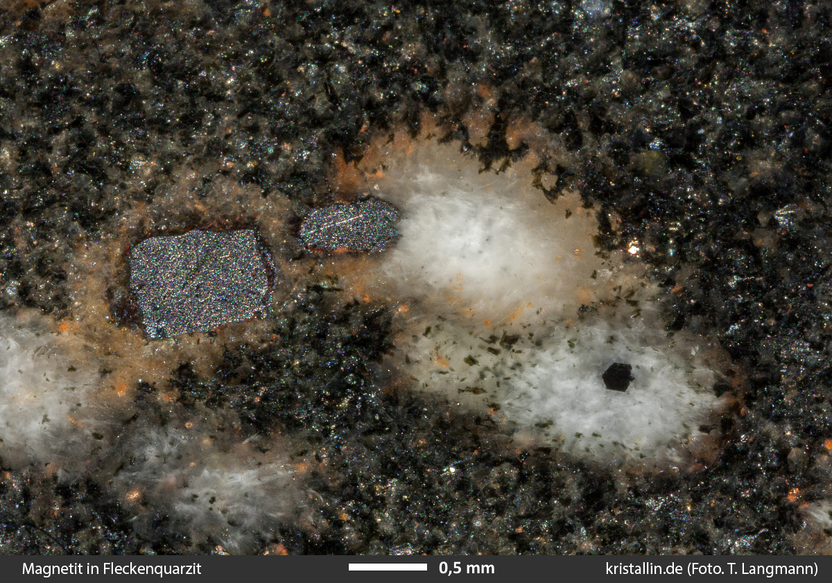 Die dunkelgraue Grundmasse besteht aus Quarz und Biotit, die undeutlich konturierten Flecken vermutlich ausschließlich aus Sillimanit. Ihre faserige Beschaffenheit wird im vorliegenden Fund erst unter dem Mikroskop sichtbar. Die großen und reflektierenden Mineralkörner in der Bildmitte sind Magnetit, der sich in manchen Fleckenquarziten mit einem Handmagneten nachweisen lässt. Foto: T. Langmann.