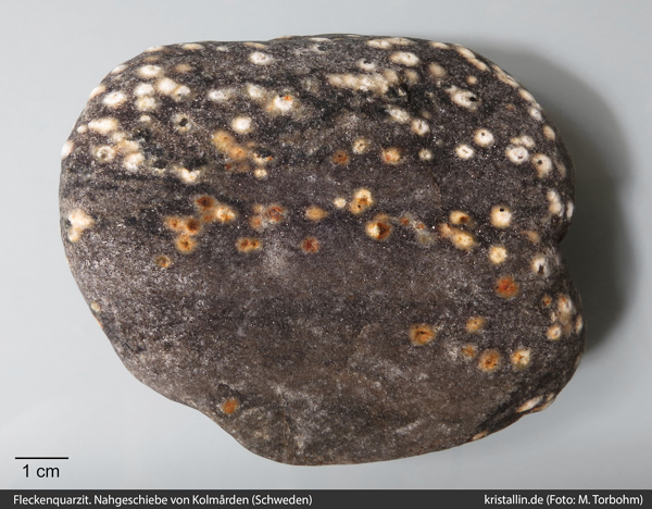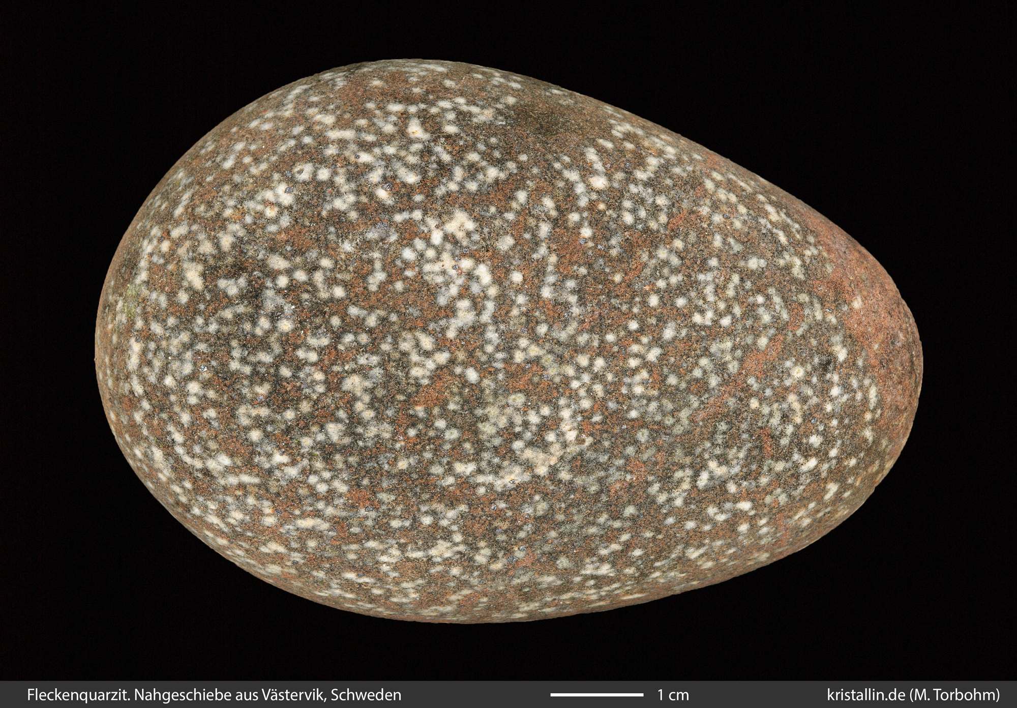 Die Grundmasse besteht aus Quarz und etwas Dunkelglimmer, wobei der Glimmeranteil von Hand kaum abzuschätzen ist, wohl aber immer recht gering zu sein scheint. Unter der Lupe erkennt man in den Flecken manchmal fein verfilzte Aggregate, was ein Hinweis auf Sillimanit ist. Sillimanit widersteht der Verwitterung eher als die Grundmasse aus Quarz und Glimmer, deshalb stehen die Flecken auf angewitterten Geschieben gelegentlich erhaben oder pockenartig über der Gesteinsoberfläche (Abb. 2). Feldspat ist makroskopisch nicht erkennbar.