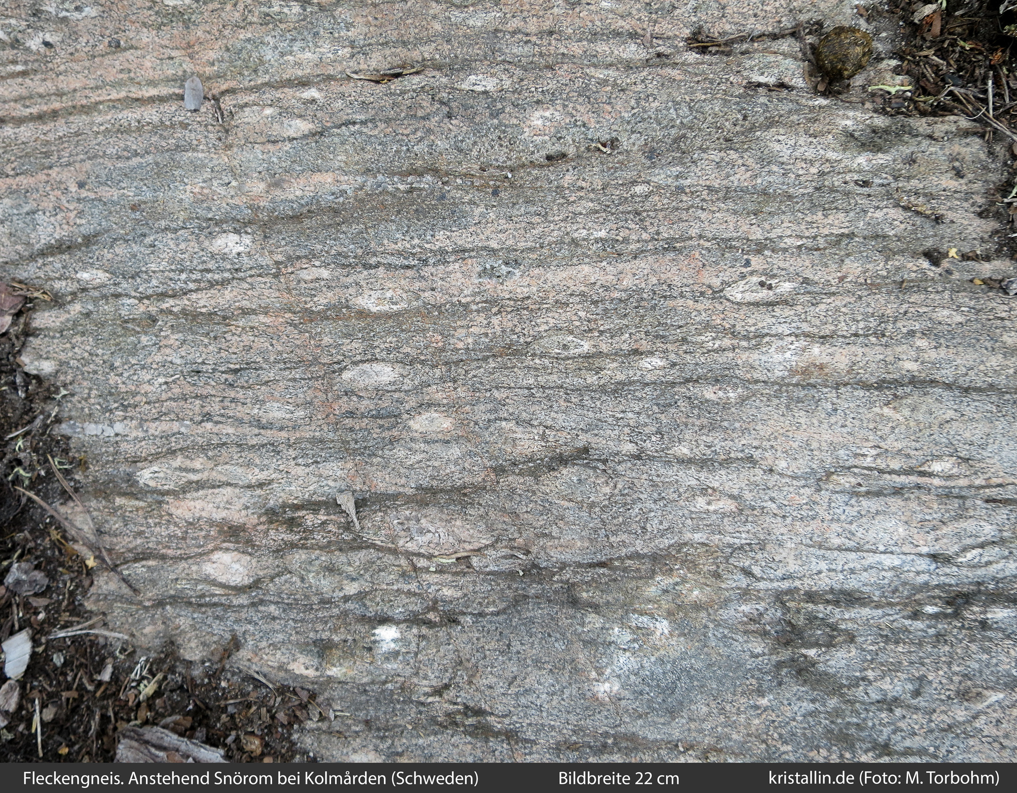 Im nördlichen Östergötland finden sich aber nicht selten graue und kleinkörnige Fleckengneise aus Quarz, Feldspat und Glimmer - anstehend und als Nahgeschiebe in Kiesgruben. Die hellen Flecken sind meist elliptisch oder linsenförmig geformt und können eine Länge von einigen Millimetern bis mehreren Zentimetern erreichen. Nur wenige Funde dieser Fleckengesteine sind undeformiert, die meisten besitzen ein gneisiges oder schieferartiges Gefüge.