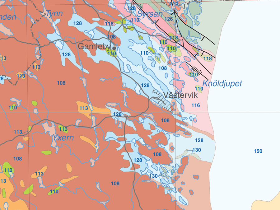 (7/26) Das Herkunfstgebiet der Västervik-Quarzite liegt an der südostschwedischen Küste. Hellblau die Metasedimente der Västervik-Formation: Quarzite, Fleckengesteine und Fleckenquarzite.