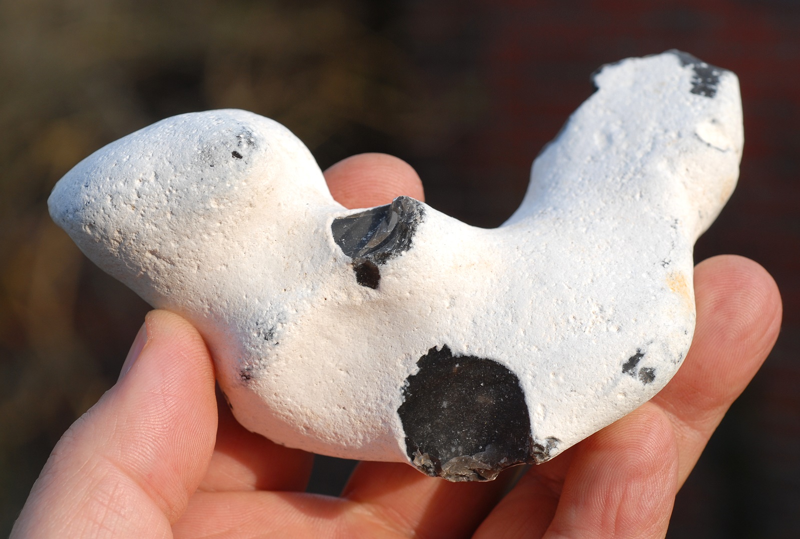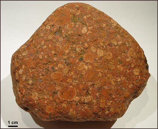Was sind Leitgeschiebe? Da die Gletscher bei ihrer Bewegung massenhaft Gesteine mitgenommen haben, kann man, wenn man die Herkunft dieser Steine ermittelt, Rückschlüsse auf die Bewegungen des Eises ziehen. Dazu braucht man typische, leicht wiedererkennbare Gesteinstypen, die aus einer eingrenzbaren Region im Norden stammen. Finden sich diese Gesteine hier im Geschiebe, beweist das den Transport aus dieser Landschaft zu uns. Solche Gesteinstypen, die unverwechselbare Merkmale haben und in Skandinavien nur in einer Gegend vorkommen, nennt man „Leitgeschiebe". Ein Beispiel für ein solches Leitgeschiebe ist der folgende Rapakiwi-Granit.
