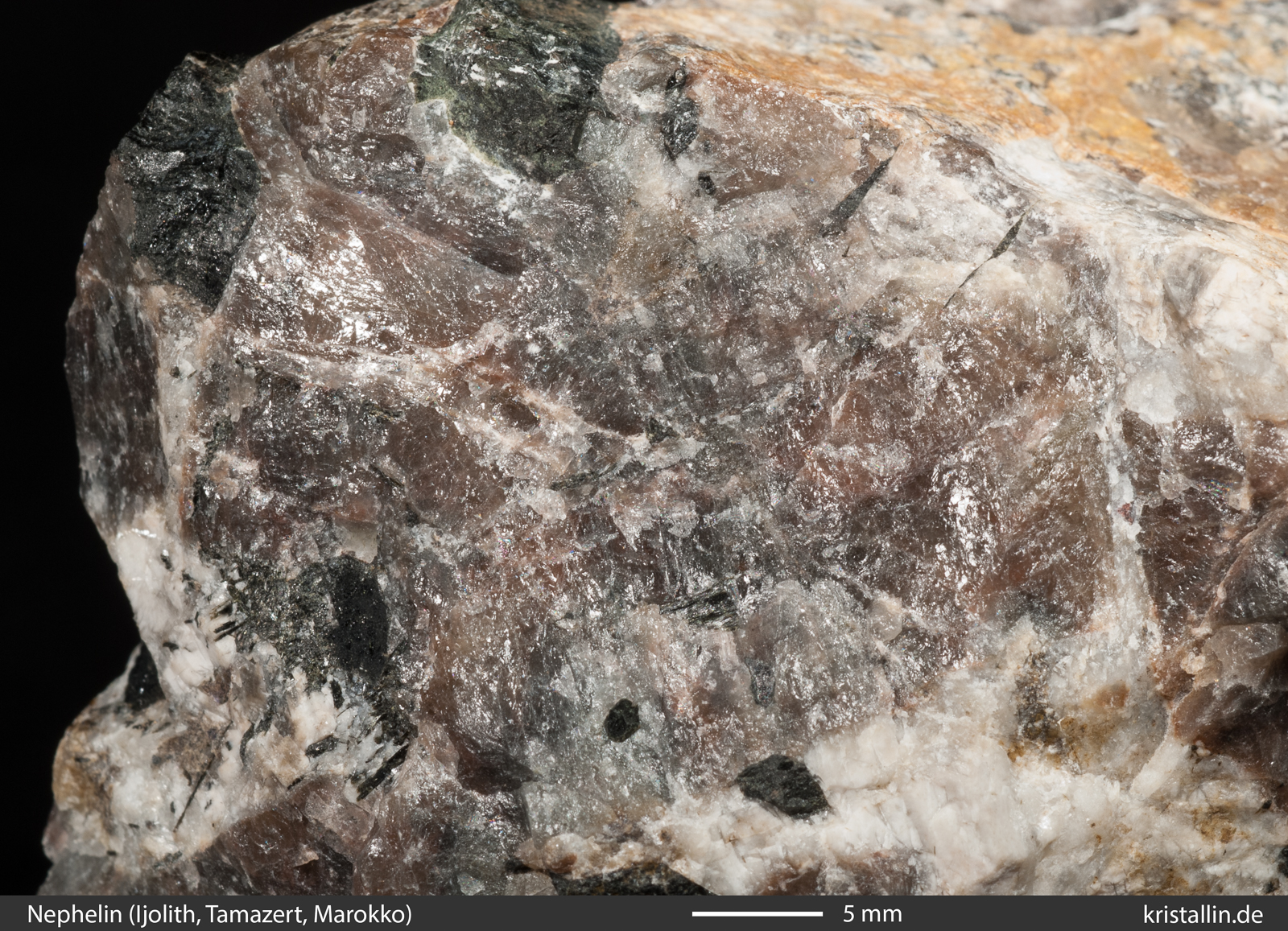 Im Ausschnitt ist erkennbar, dass der im normalen Licht gelbbraune Nephelin