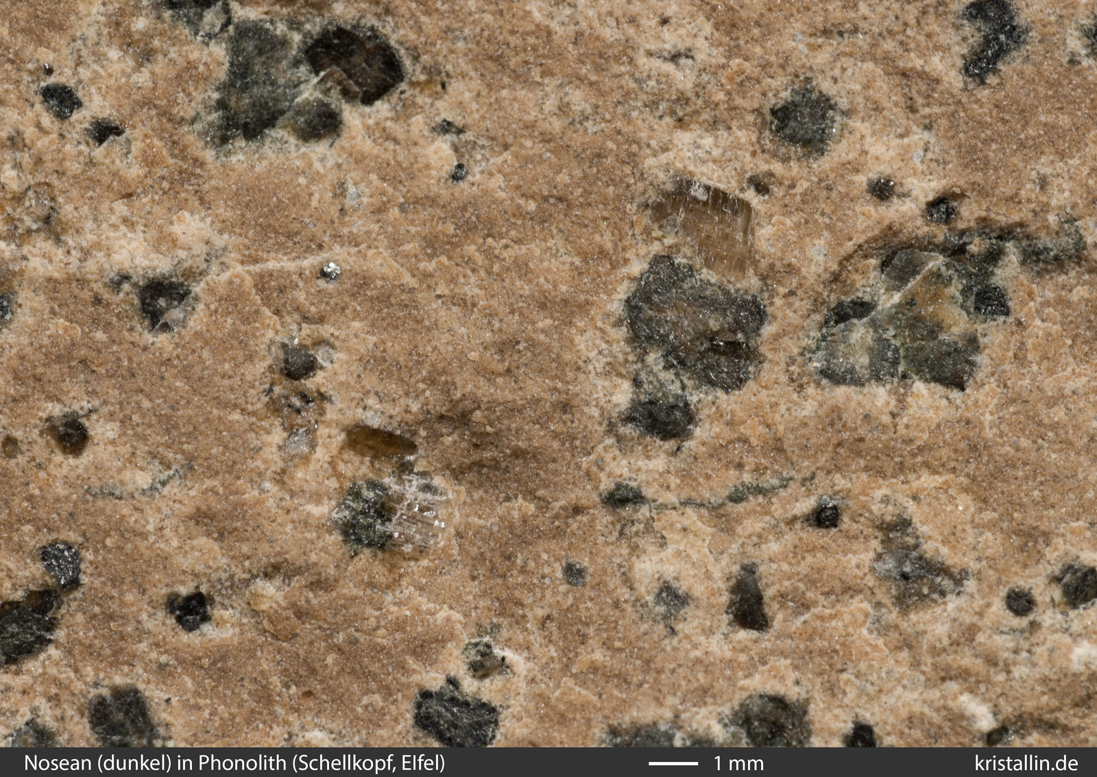 Nosean ist das dunkle Mineral. Die klaren Einsprenglinge sind Sanidine.
