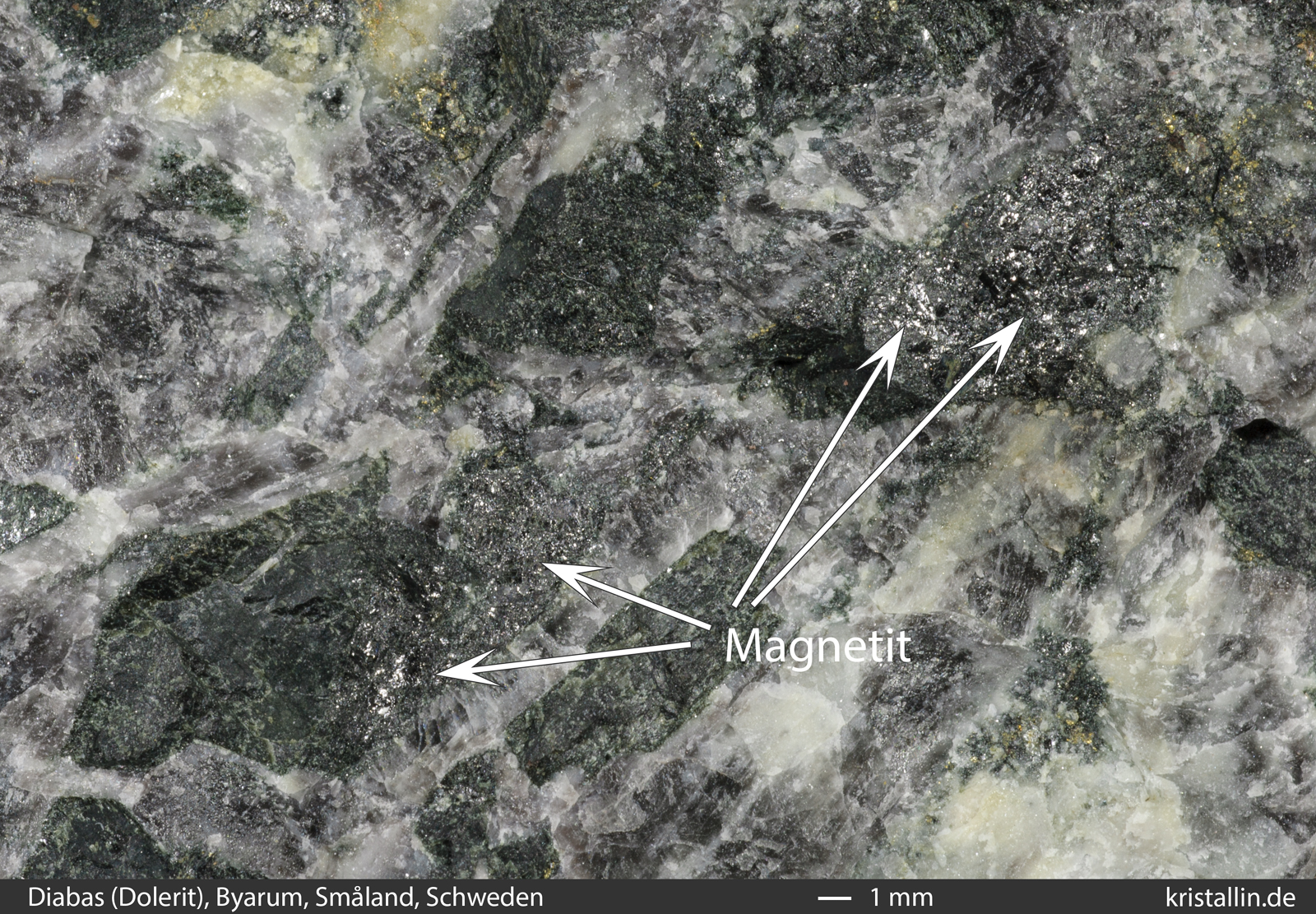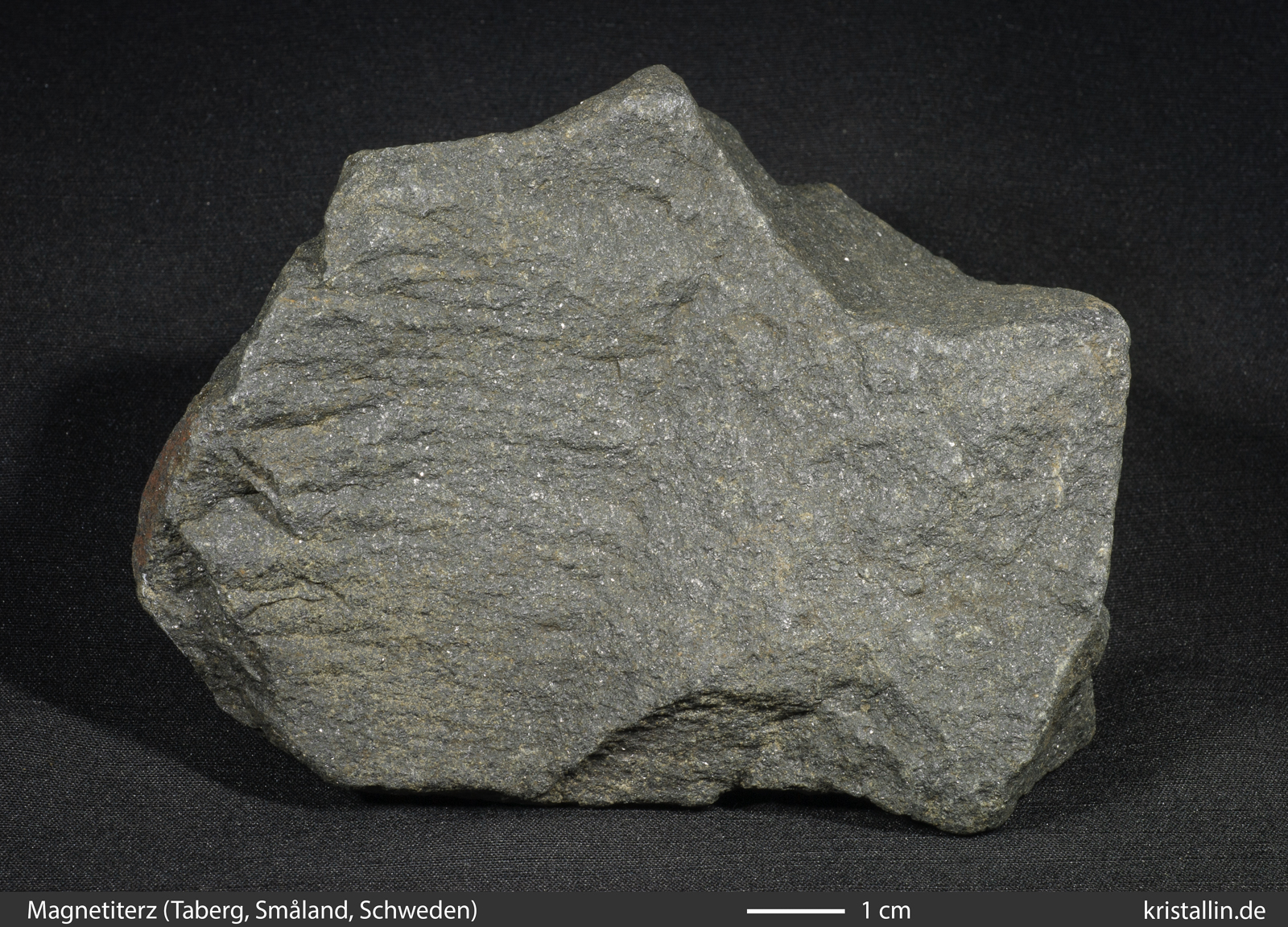 Magnetit als derbes Mineral vor. Das rechte Bild zeigt so ein magnetitreiches Erz. Es stammt vom Taberg in Südschweden. Da viele dunkle Gesteine
