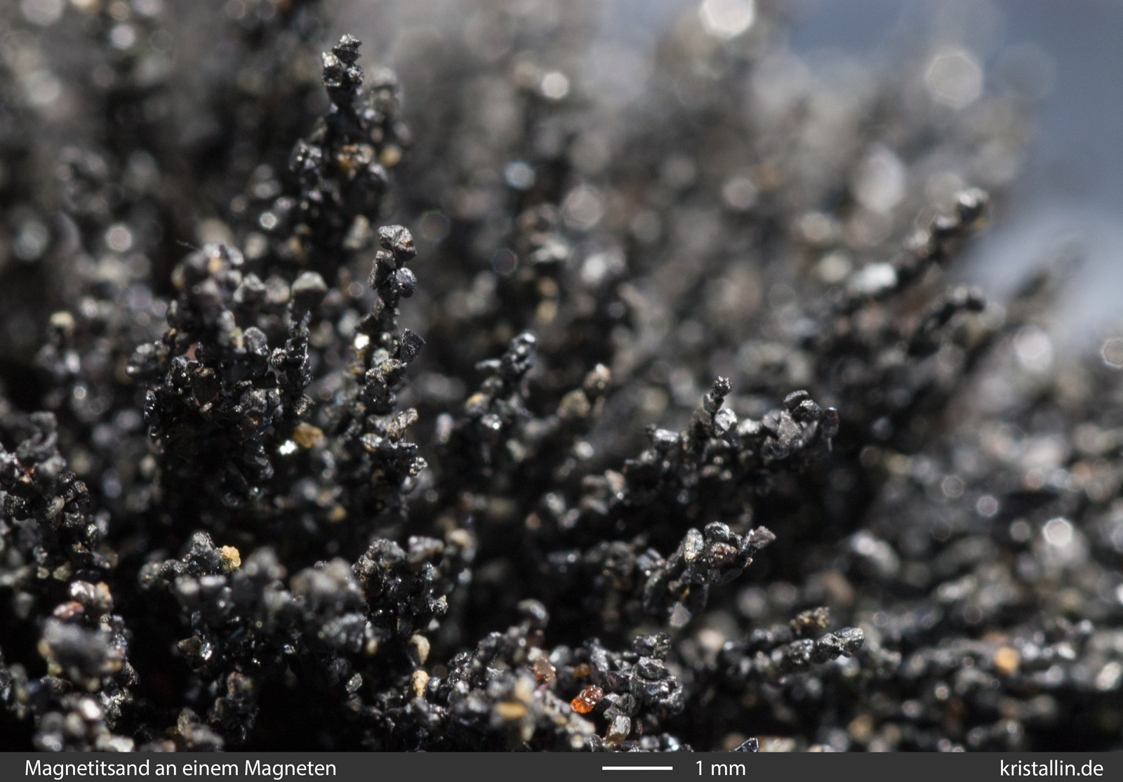 finden Sie den grau-metallischen Magnetit direkt unter dem Magneten. Magnetit ist ein robustes