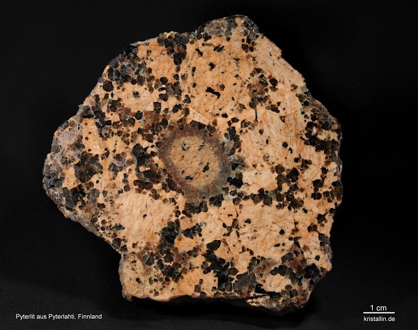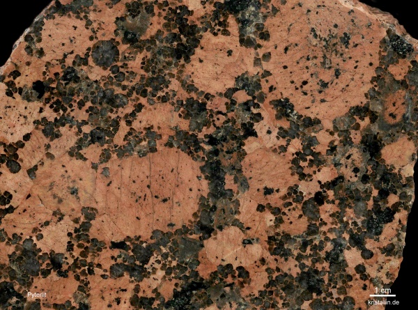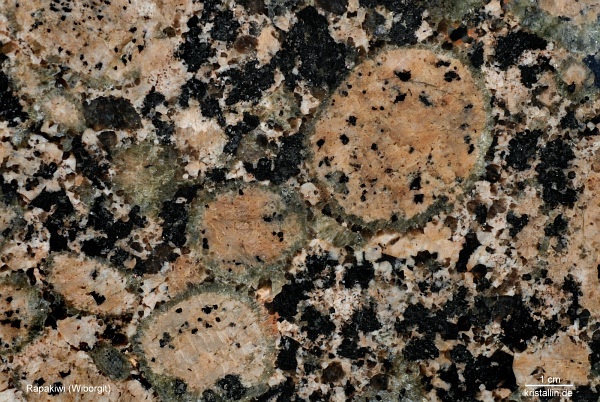 Pyterlit: Rapakiwis zeichnen sich durch auffällige runde Feldspäte (Ovoide) aus *). Diese Granite kommen in zwei Gefügeformen vor: Wiborgit und Pyterlit, wobei ersterer mengenmäßig überwiegt. Beim Pyterlit gibt es jedoch, im Gegensatz zum Wiborgit, kaum von Plagioklas gesäumte Feldspäte. Statt dessen umgeben viele kleine und auffällig kantige Quarze die runden Kalifeldspäte. ![]() Pyterlit aus Pyterlahti, Südostfinnland. Zwar kommen immer noch einzelne Säume von Plagioklas vor (oben, Bildmitte), aber die allermeisten Feldspäte sind von Quarzen umgeben, die eine Tendenz zum sechseckigen Habitus haben. Die Nahaufnahme unten zeigt das deutlicher: ![]() Kantige Quarze sind in magmatischen Gesteinen selten. Sie sind ein Indikator für ungewöhnlich hohe Temperaturen bei der Kristallisation, was auf besonders wasserarme Magmen schließen läßt - typisch für Rapakiwis. Sechseckige Querschnitte zeigen, daß zumindest ein Teil der Quarze als Hochquarz kristallisierte, also der Hochtemperaturform von Quarz. Im Geschiebe sind es praktisch ausschließlich Pyterlite, in denen solche Quarze vorkommen. Diese Gesteine werden als Werkstein verkauft und sind im Handel unter den Namen "Carmen Red" oder "Karelia Red" erhältlich. Karelia Red sieht so aus: ![]() Die Steinbrüche befinden sich in Südostfinnland, nahe der russischen Grenze. Der Pyterlit dort ist Teil des Wiborgplutons. Zur Geschiebekunde: Pyterlite können im Geschiebe gefunden werden, sind aber sehr selten. Solche Gesteine gibt es lokal auf Aland, im Südwesten Finnlands (Vehmaa + Laitila) und, wie schon erwähnt, im Wiborgpluton. Kantige Quarze findet man auch in Gefügen ohne Ovoide und in gleichkörnigen Gesteinen. > Daher sollten nur solche Rapakiwis als Pyterlit bezeichnet werden, die wirklich Ovoide enthalten! Gesteine ohne Ovoide sind keine Pyterlite, auch wenn sie voller kantiger Quarze sind. Die Rapakiwis mit den runden Feldspäten zeichnen sich durch zwei Generationen von Quarz aus. Das gilt für Pyterlit ebenso wie für Wiborgit. In den Pyterliten sind aber die gerundeten, großen Quarze deutlich seltener als in Wiborgiten und oft viele Zentimeter voneinander entfernt. Die kantigen Quarze im Pyterlit bilden die jüngere Generation, die in Wiborgiten deutlich kleiner sind. Unten: Wiborgit zum Vergleich. Die meisten Ovoide sind von Plagioklas gesäumt, die zweite Generation der Quarze steckt in der Grundmasse und kann nur mit einer starken Lupe sicher erkannt werden. ![]() Wiborgit aus der Nähe von Ylämaa, Südostfinnland. *) Neben den typischen Rapakiwis, wie sie hier gezeigt werden, gibt es auch Formen, die keine Ovoide enthalten oder sogar gleichkörnig sind. Die Gefüge innerhalb der Rapakiwiplutone sind überaus vielgestaltig - trotzdem gehören auch die anderen Varianten mit zu den Rapakiwis. |