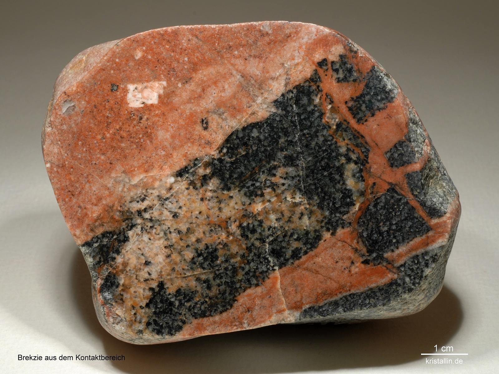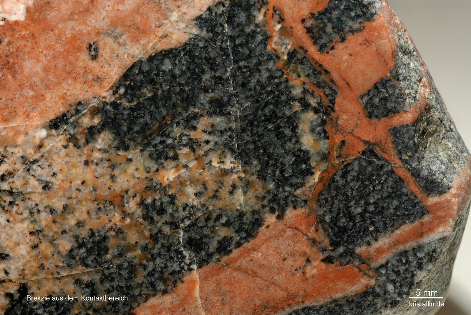 Unten: Brekzie, die beim Eindringen des roten Rapakiwigranits in den Gneis
