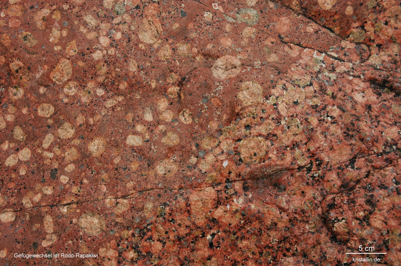 Unten: Die Grenzflächen zwischen dem grobkörnigen Rapakiwi und dem