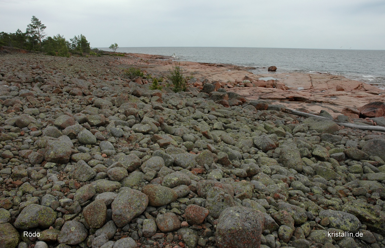 Geröllstrand. Im Vordergrund der anstehende Rödö-Rapakiwi.