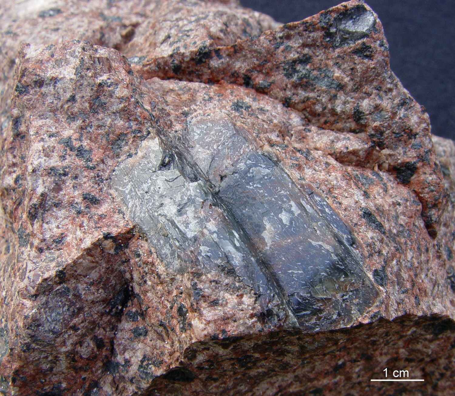 Beachten Sie im oberen Bild die runden, schwarz gesäumten Quarze und die Reste von Basalt in der rechten Bildhälfte. Zusätzlich zu diesen schwarzen Xenolithen stecken mitten im Granit einzelne große Plagioklase. Sie sind Überbleibsel des eingedrungenen Basaltmagmas, in dem die Bildung der Plagioklaskristalle schon weit fortgeschritten war. Ein Granitporphyr mit einzelnen großen Plagioklasen ist eine bizarre Angelegenheit. So ein Gestein kann nicht aus einem einheitlichen Magma und in einem Abkühlungsvorgang entstehen. Der große Kristall im nächsten Bild ist ein solcher Plagioklas und zeigt eine schöne polysynthetische Verzwilligung, die parallel zur Längsrichtung des Kristalls verläuft. In der Großaufnahme ist es deutlich zu erkennen. Das Gestein stammt ebenfalls aus dem Westhafen von Mariehamn. | ||||||||||||||||||||||||||||||||||||||||||||||||||||||||||||||||||||||||||||||||||||||||||||||||||||||||||||||||||||