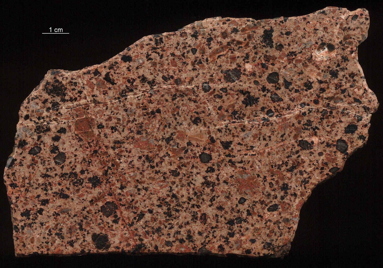 Granitporphyre sind auf Åland in wesentlich größerer Ausdehnung zu finden als die Quarzporphyre. Beide unterscheiden sich im Hinblick auf die Korngröße in der Grundmasse. Als Quarzporphyre werden in der Geschiebekunde die Formen bezeichnet, deren Grundmasse dicht, also nicht in Minerale auflösbar erscheint, während Granitporphyre eine körnige Grundmasse zeigen. Diese Unterscheidung wird auf den finnischen geologischen Karten nicht gemacht. Dort wird das abgebildete Gestein einheitlich als Quarzporphyr bezeichnet. Genauer gesagt: quarzporphyrischer Rapakiwi-Granit. Beide Formen (Granit- und Quarzporphyr) haben eine granitische Zusammensetzung. Auf der Oberfläche von Geschieben fallen zuerst die gerundeten Quarze inmitten der körnigen Grundmasse auf. Feldspäte dagegen finden sich als meist unauffällige Einzelkristalle. Sie sind mehr oder wenig idiomorph, gelegentlich auch gerundet. Sie haben verschiedene Größen, beginnend bei wenigen Millimetern bis zu mehreren Zentimetern. Besonders die größeren Einsprenglinge können gerundet sein und zeigen Plagioklassäume. Die Farbe kann von der Grundmasse verschieden sein oder auch vom gleichen Rotbraun. Gefüge mit gerundeten plagioklasgesäumten Feldspäten stehen am Übergang zum klassischen Rapakiwi. Die Grundfarbe des Granitporphyrs schwankt zwischen kräftig rot, rotbraun und hellbraun-rötlich, fast grau. Das erste Bild zeigt eine helle Form. Sie stammt vom westlichen Hafen in Mariehamn auf Åland. Polierter Schnitt: | ||||||||||||||||||||||||||||||||||||||||||||||||||||||||||||||||||||||||||||||||||||||||||||||||||||||||||||||||||||