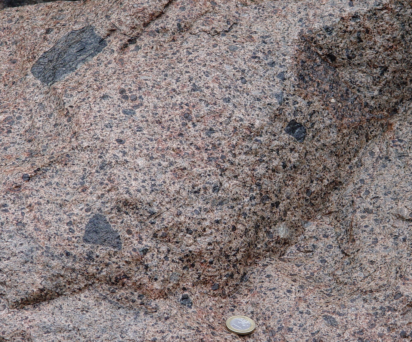 Die Besonderheit dieses Granitporphyrs liegt in seiner Herkunft. Wir haben es mit einem Rapakiwigestein zu tun, dessen Zusammensetzung einige Besonderheiten aufweist. Der Granit hat bei seiner Entstehung Magma basaltischer Herkunft aufgenommen. Das trifft für Rapakiwis generell zu, aber hier kann man die Spuren dieser Magmenvermischung besonders schön sehen. Die abgebildeten Proben stammen aus dem westlichen Hafen von Mariehamn. (Vom Museumsschiff "Pommern" aus nur einige hundert Meter nach Norden.) Die beiden folgenden Bilder zeigen den dort anstehenden Fels (auf der Karte Nr. 17). Beachten Sie die dunklen Basalteinschlüsse. In der Bildmitte liegt ein 1-Euro-Stück (2,2 cm Durchmesser). | ||||||||||||||||||||||||||||||||||||||||||||||||||||||||||||||||||||||||||||||||||||||||||||||||||||||||||||||||||||