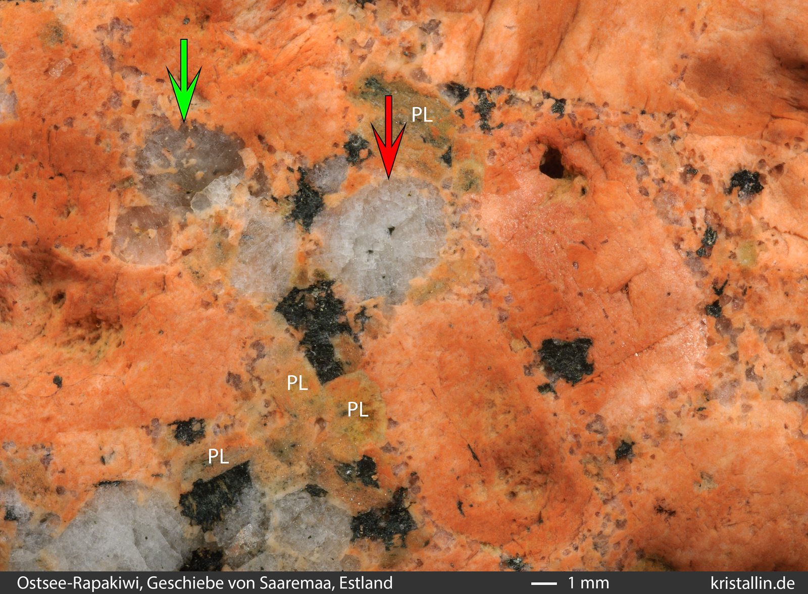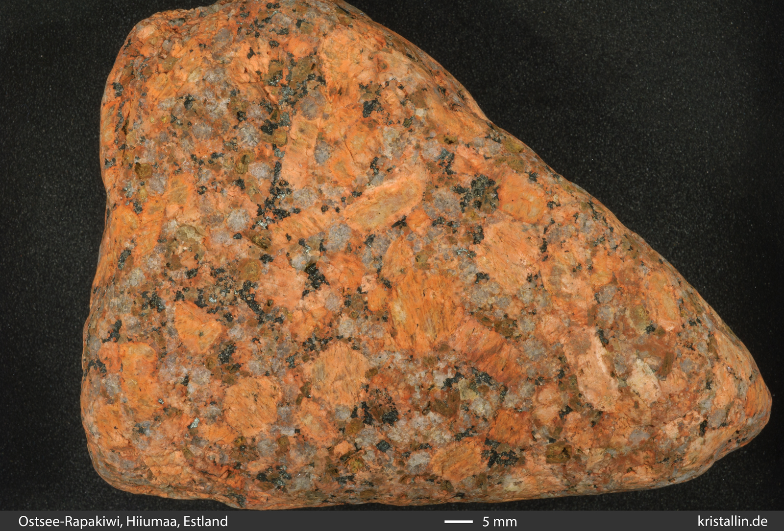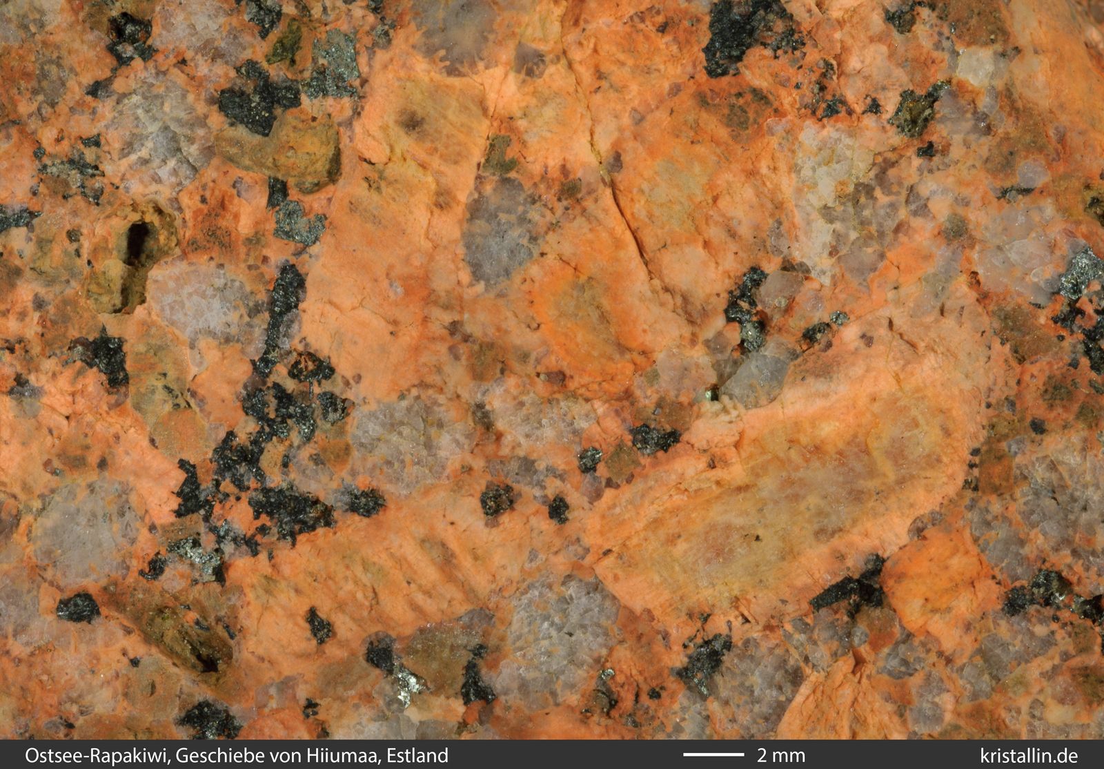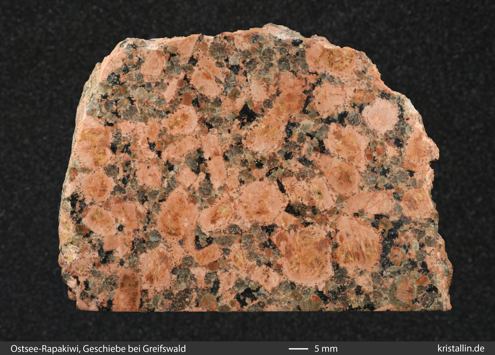 Kennzeichen der Ostsee-Rapakiwis vorhanden. In diesem Stück sind die