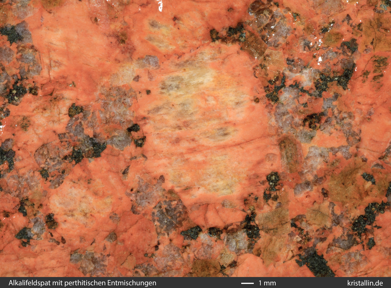 gelblichem Alkalifeldspat mit kräftigen perthitischen Entmischungen.