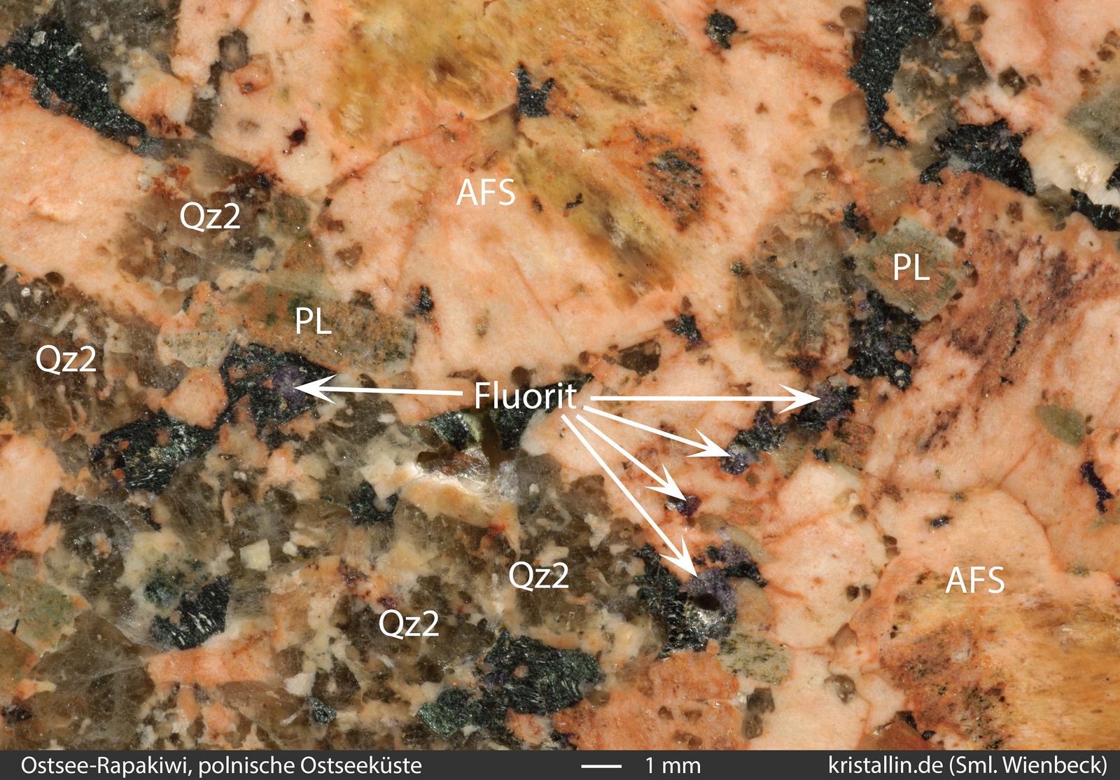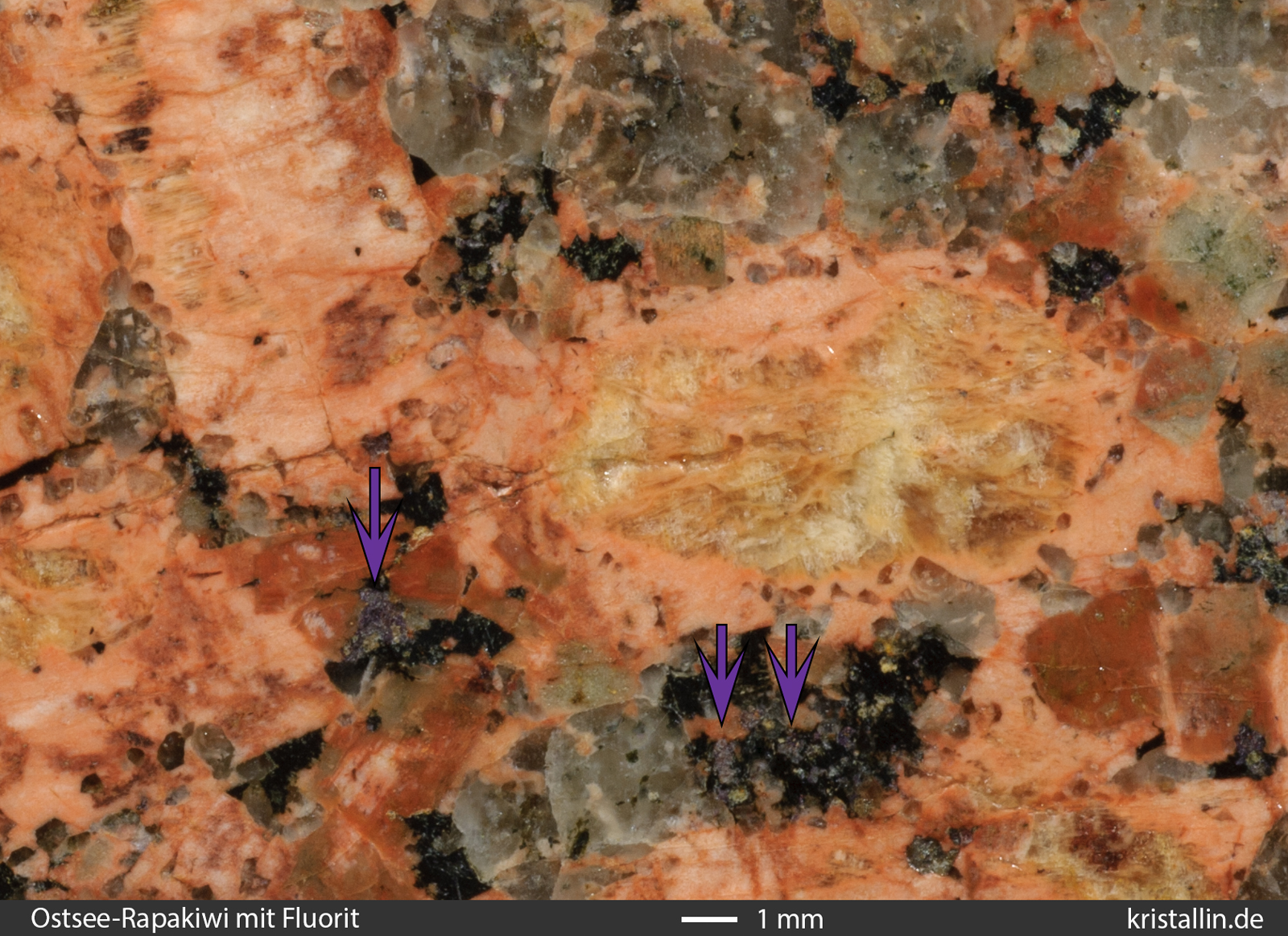 Ostsee-Rapakiwis enthalten kleine violette Fluoritkörner, die in der