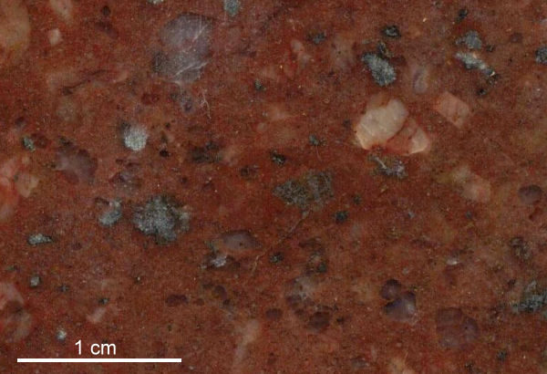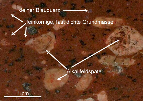 Die Anstehendprobe enthält etwas mehr vom bläulichen Quarz, die Grundmasse ist ebenfalls feinkörnig. Wenige Alkalifeldspäte, die nur teilweise gerundet sind. | ||||||||||||||||||||||||||||||||||||||||||||||||||||||||||||||||||||||||||||||||