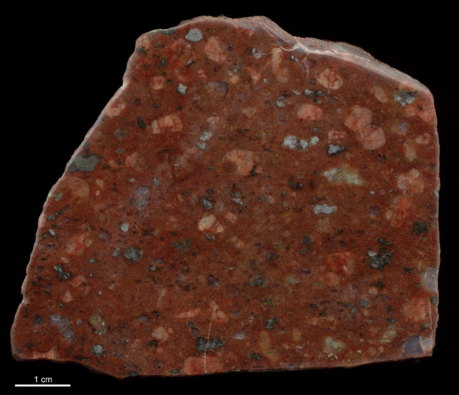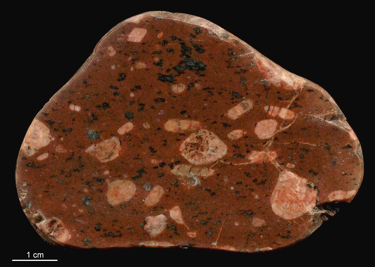 Dieser Porphyr gehört zu den quarzführenden Porphyren Smålands. Vom ähnlich aussehenden Påskallavik-Porphyr unterscheidet ihn die rosagrau bis rötlichbraun gefärbte, feinkörnige Grundmasse, in der sich meist weniger Einsprenglinge finden. Die Alkalifeldspäte sind weniger stark gerundet, teilweise etwas eckig. Vereinzelt Plagioklase. Die Quarze sind auch hier oft blau, sie treten aber mengenmäßig in den Hintergrund und können in kleinen Geschieben auch ganz fehlen. Zuerst ein Geschiebe von Fehmarn. Polierter Schnitt. | ||||||||||||||||||||||||||||||||||||||||||||||||||||||||||||||||||||||||||||||||