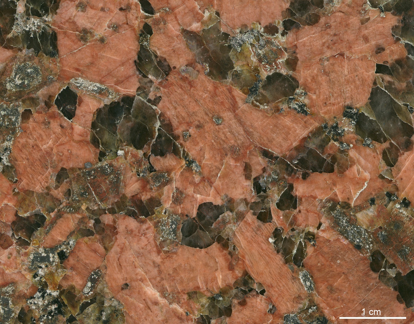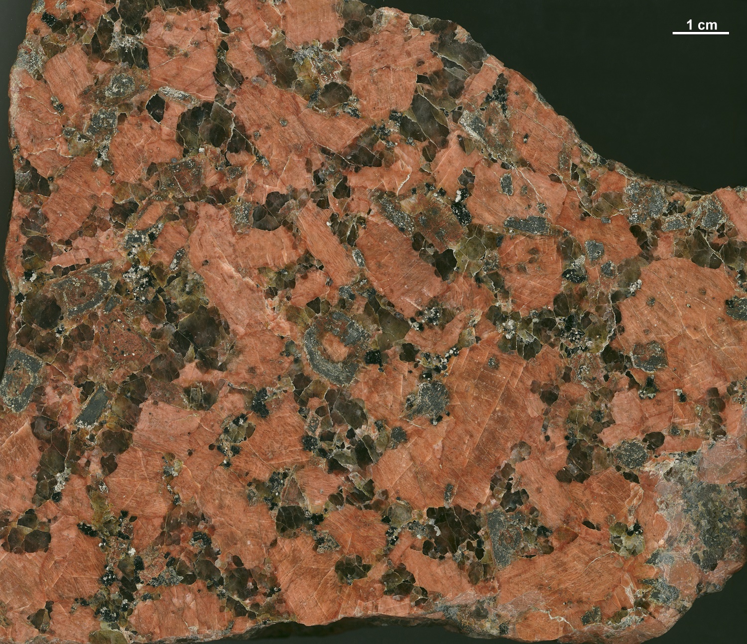 ausgesprochen grobkörnig und besteht überwiegend aus rotem Alkalifeldspat