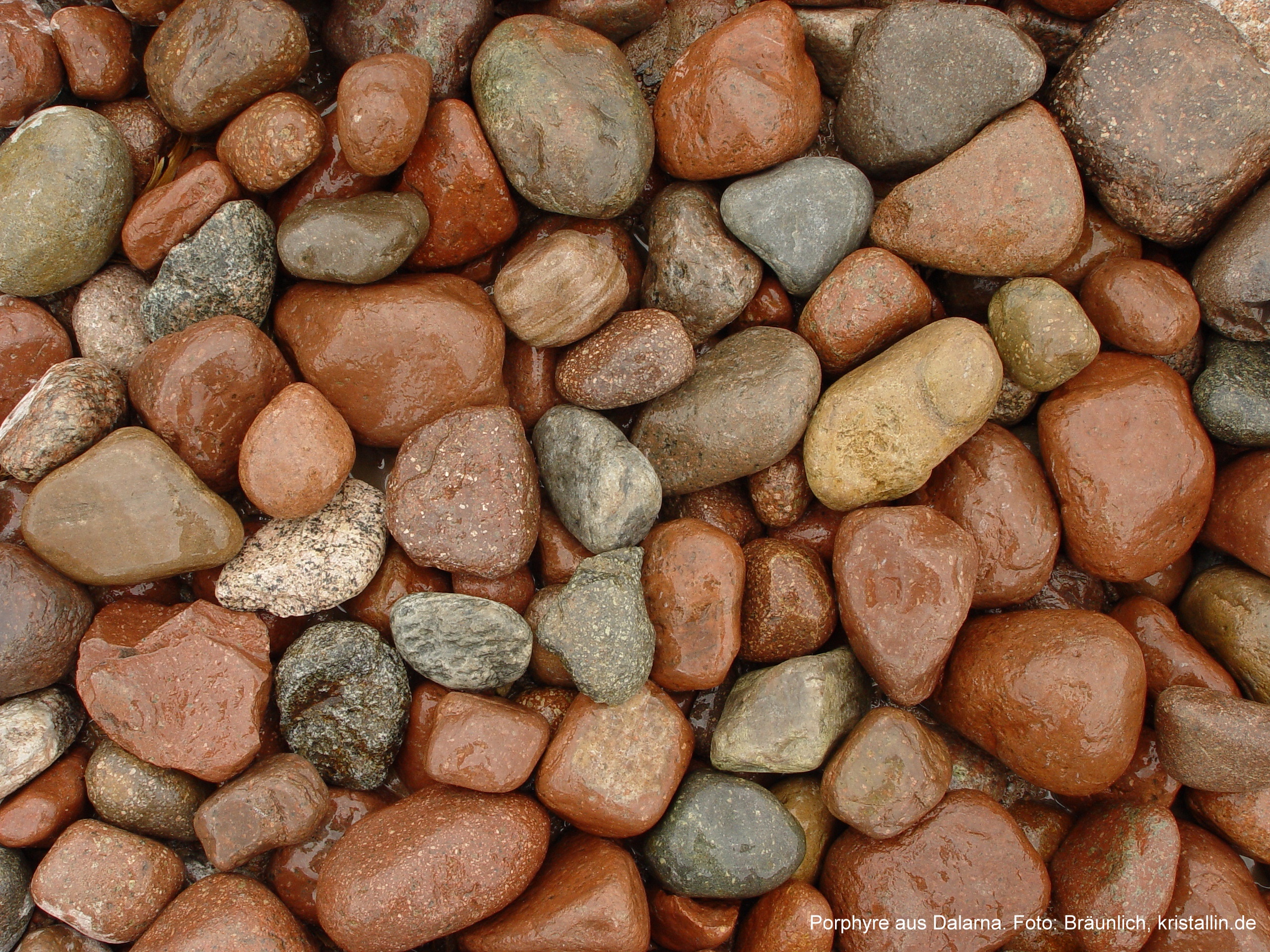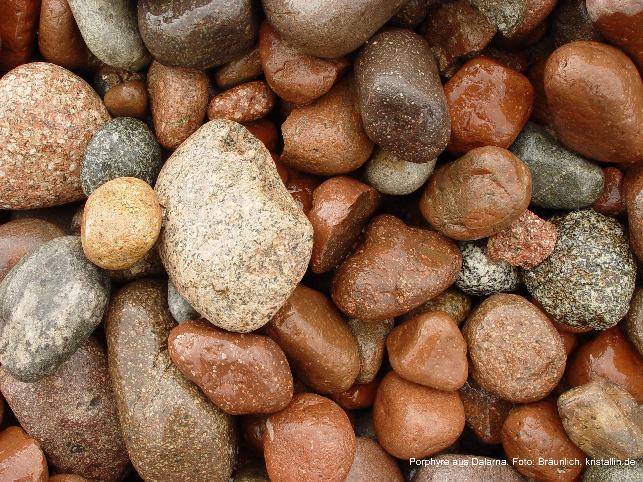 die rotbraune Gesamtfarbe des Geschiebes. Dieser Farbton rührt vor allem vom Bredvad-Porphyr her, der mit großem Abstand das dominierende Gestein