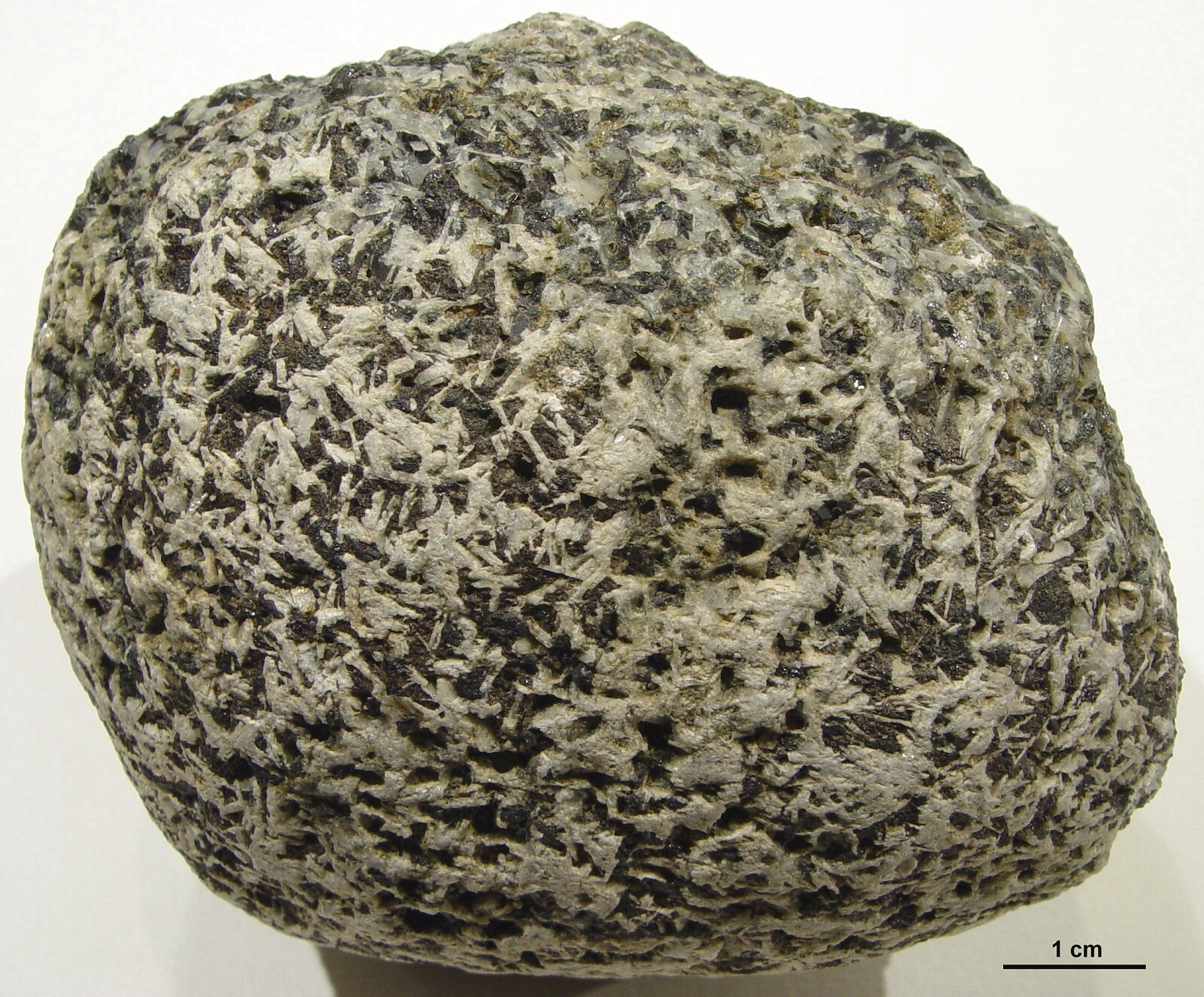 Unten: Ein Ausschnitt aus der angewitterten Oberfläche, auf der das typische ophitische Gefüge schön zu sehen ist.. Die Löcher in der Oberfläche rühren von ausgewitterten Mineralen her. | |||||||||||||||||||||||||||||||||||||||||||||||||||||||||||||||||||||||||||||||