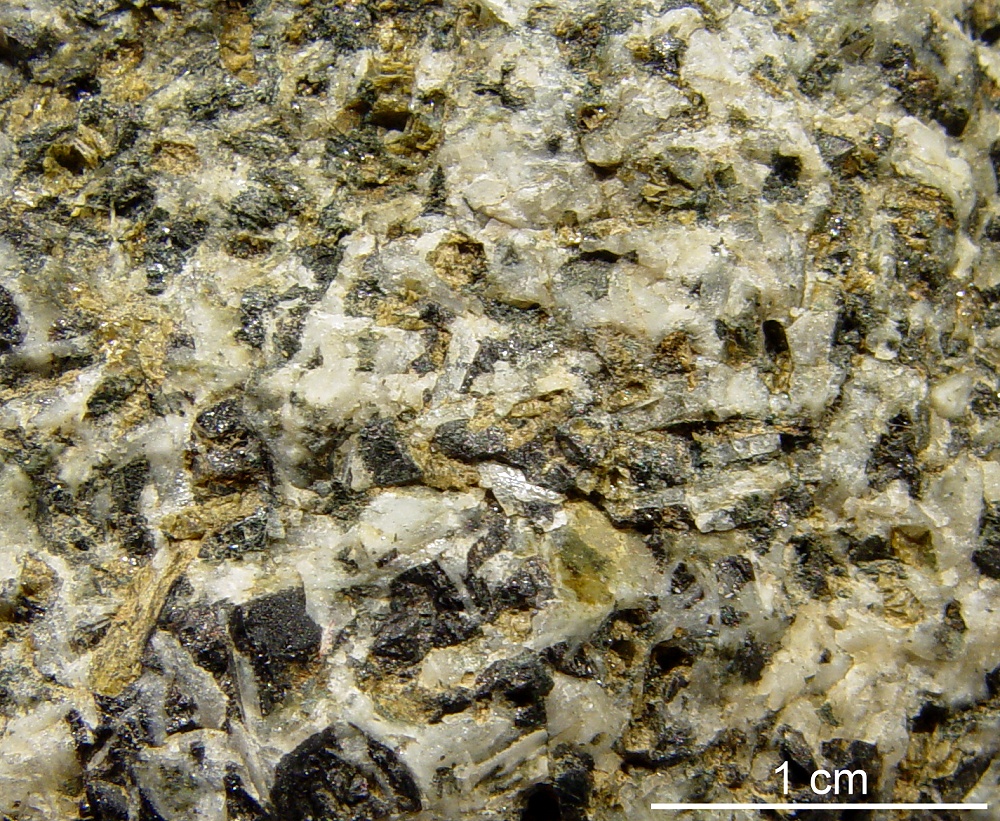 Das gleiche Handstück ist außerdem noch ein schönes Beispiel für einen Olivindiabas. Das nächste Foto zeigt eine vergrößerte Bruchfläche mit Olivin (gelbes Mineral) im Gefüge. | |||||||||||||||||||||||||||||||||||||||||||||||||||||||||||||||||||||||||||||||