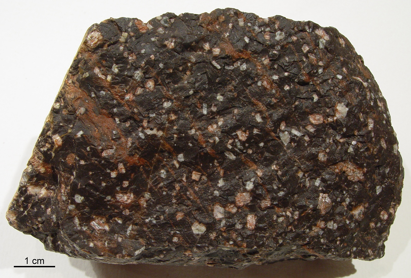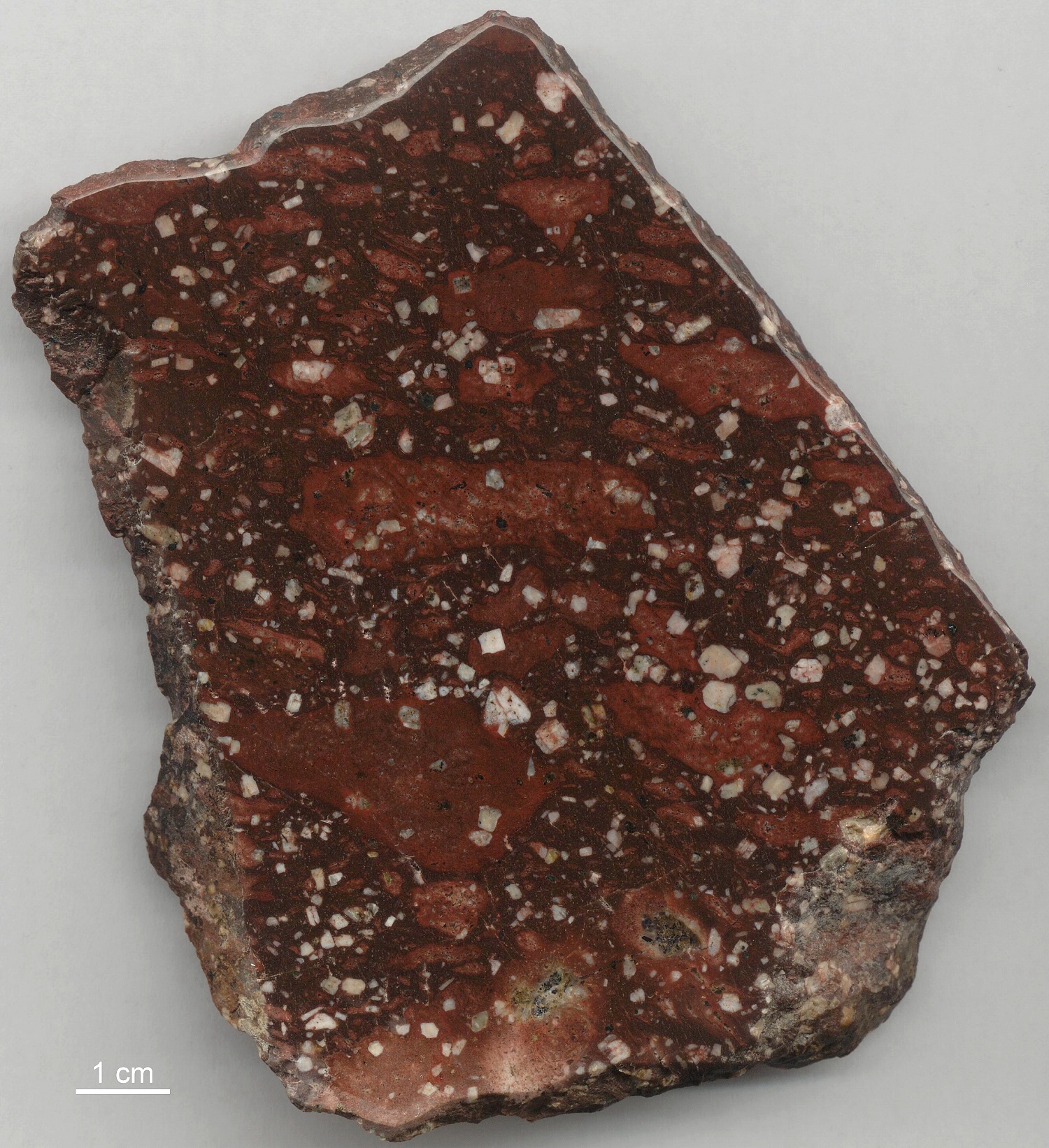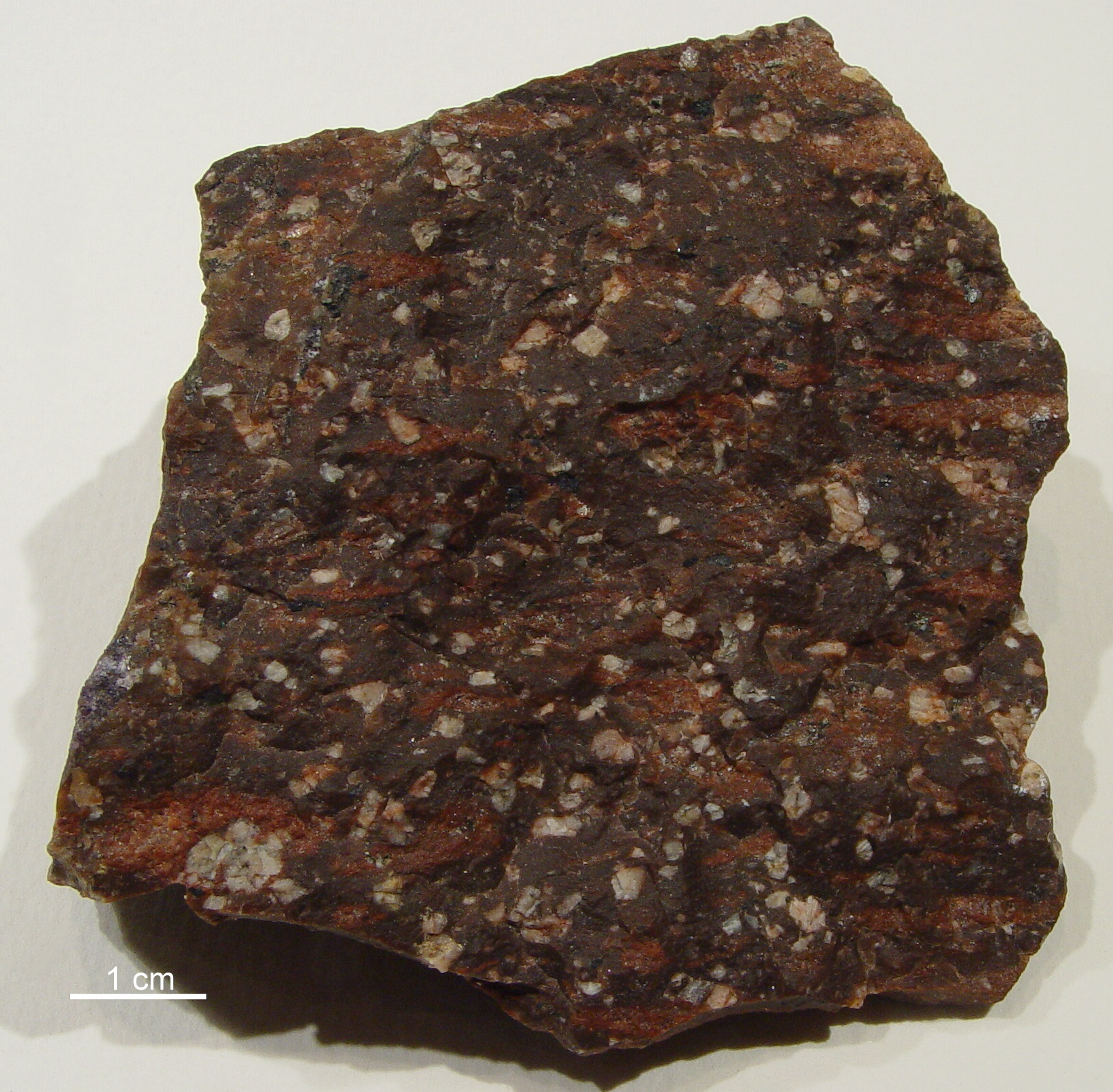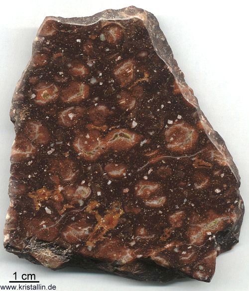 Die Grundmasse kann unterschiedliche Farben haben. Meist ist sie rotbraun oder violett-schwarz gefärbt. Das nächste Stück stammt ebenfalls aus dem Anstehenden bei Orsa in Dalarna. Die Bimsstreifen laufen von oben links nach unten rechts. | |||||||||||||||||||||||||||||||||||||||||||||||||||||||||||||||||||||||||||||||||