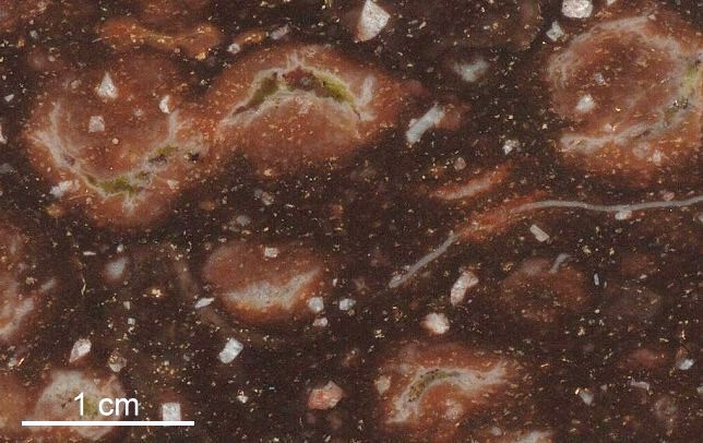 Die wichtigsten Merkmale der Ignimbrite aus Dalarna sind die Kristalleinsprenglinge in einer dichten Grundmasse sowie kurze Streifen von flachgedrückten ehemaligen Bimsfladen. Diese Streifen sind meist leicht gewellt und schmiegen sich um die Einsprenglinge herum. (Die Feldspatkristalle waren bei der Ablagerung schon fertig und wurden zusammen mit dem Bims und dem Material der Grundmasse abgelagert.) | . | ||||||||||||||||||||||||||||||||||||||||||||||||||||||||||||||||||||||||||||||||